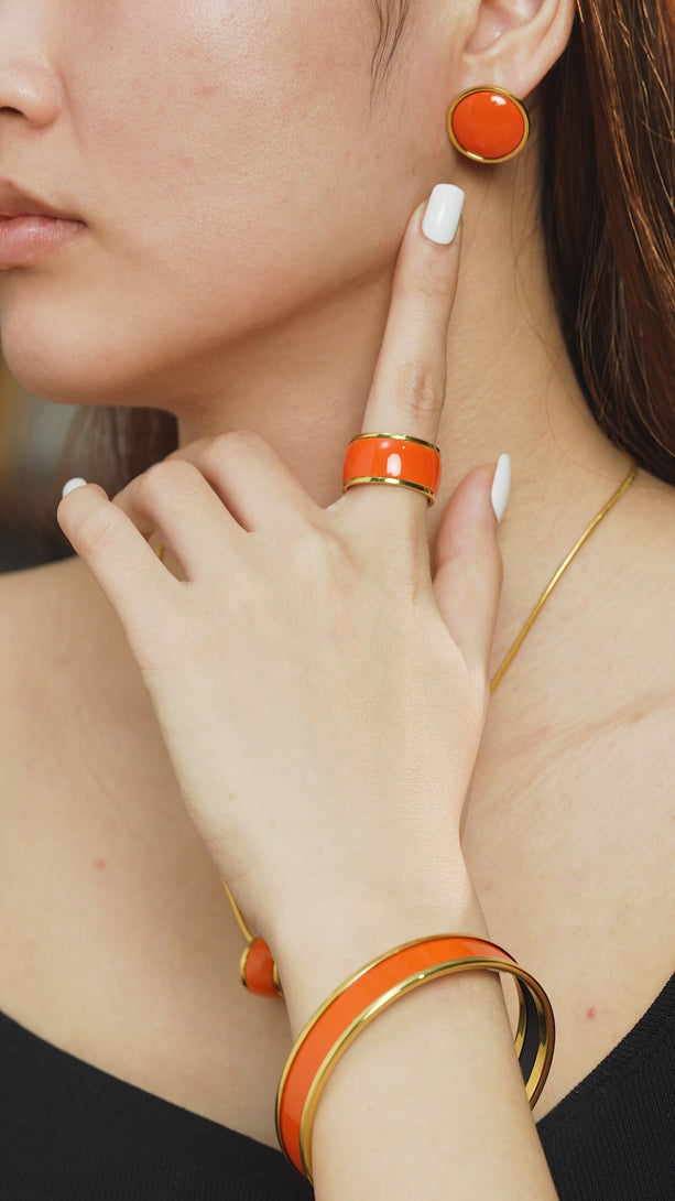 Wide band with hand-painted enamel in layered orange strokes. Fired to seal the energy.